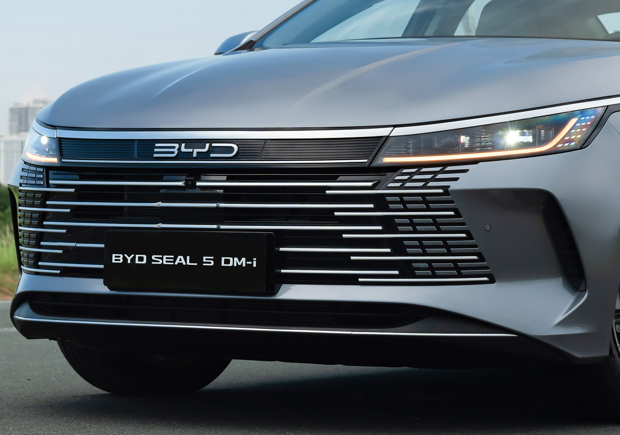 Thiết kế lưới tản nhiệt liền khối giúp đầu xe liền mạch, tạo hiệu ứng như một chiếc du thuyền rẽ sóng. Logo BYD nổi bật ở trung tâm, khẳng định bản sắc thương hiệu toàn cầu.